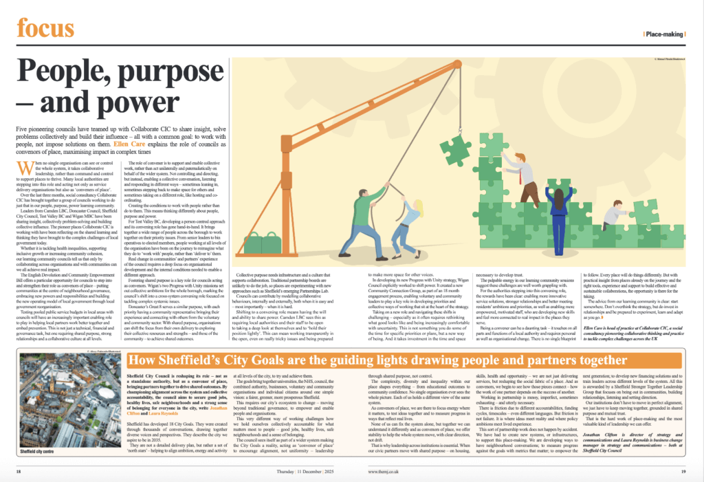 When no single organisation can see or control the whole system, it takes collaborative leadership, rather than command and control to support places to thrive. Many local authorities are stepping into this role and acting not only as service delivery organisations but also as ‘conveners of place’.